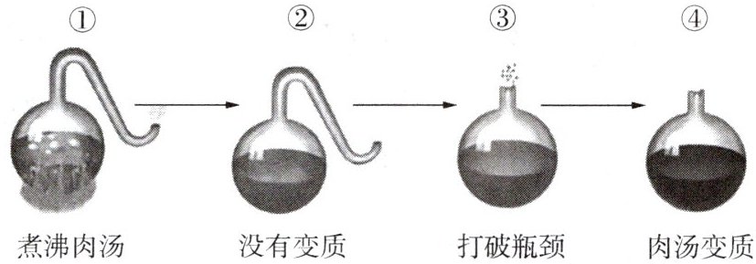 <题目>鲜美的肉汤放置久了会变酸,这是微生物的“恶作剧”。这些微生物来自哪里?法国生物学家巴斯德通过巧妙的实验解答了这一问题。下图是巴斯德的实验示意图。将鹅颈瓶内的肉汤煮沸,一段时间后,瓶内的肉汤仍然保持鲜美;接着,将瓶颈打断,数日后,瓶内的肉汤变质了。请据此回答8~10题。