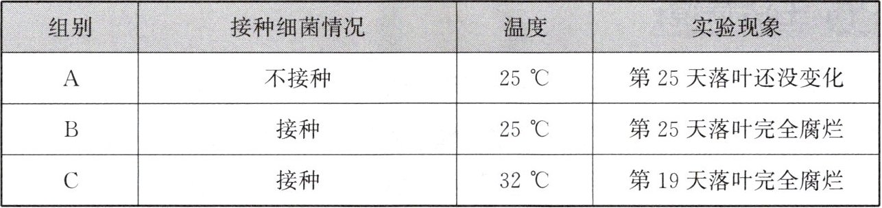 13. 为探究细菌对落叶的分解作用,某生物兴趣小组设计并实施了相关实验。将经过灭菌处理的落叶分成等量的A、B、C三组,放在无菌条件下进行培养。在实验过程中滴加等量的蒸馏水(蒸馏水中不含细菌等微生物),使落叶保持潮湿。请结合表中信息回答下列问题。