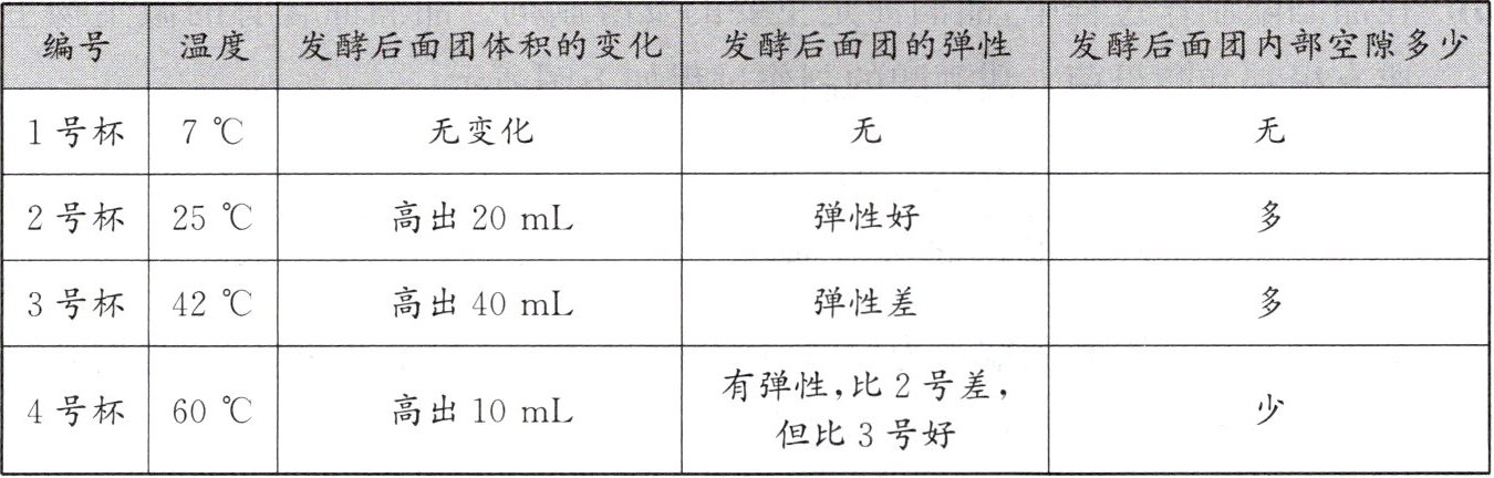 小明非常喜欢吃奶奶做的馒头。馒头是利用酵母菌发酵制作而成,麦香味十足,松软可口。为探究酵母菌发酵的最佳温度,小明做了如下实验:①在4个大碗里分别加入100g面粉、1.5g干酵母、50mL常温水,搅拌均匀,制成4个面团。②将这4个面团分别放到4个烧杯中,用标签纸做好标记,记录好面团在烧杯内所占的体积,然后盖上盖。③将4个烧杯分别放在不同温度下,1h后,观察面团的变化。实验结果如下表所示。请据此回答4~6题。