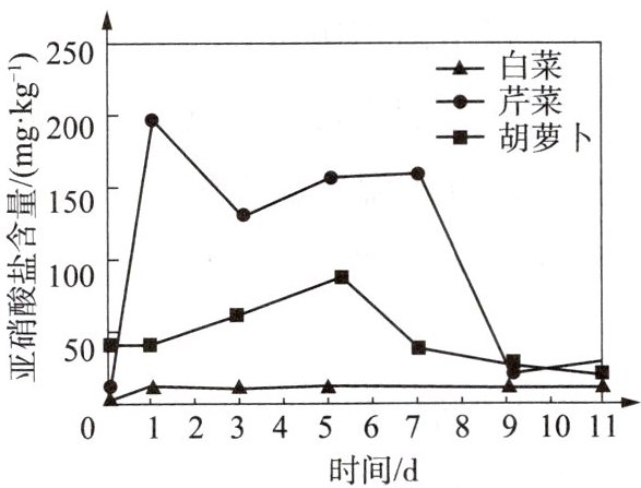 11. 泡菜因其醇香酸脆,制作方便,为人们所喜爱。但传统泡菜的制作过程中会产生亚硝酸盐,危害人体健康。某兴趣小组同学尝试了泡菜制作,并进行了亚硝酸盐含量的测定。实验过程如下:①选择等量的新鲜蔬菜(白菜、芹菜、胡萝卜)洗净后沥干水分,切成条状放入干净的泡菜坛中。②加入适量的食盐和冷却后的调味汁料(花椒、姜片和辣椒等),淹没蔬菜即可。③盖上坛盖,向坛口的凹槽内注入清水,将泡菜坛放在阴凉处。④每天取样榨汁,测量其中的亚硝酸盐含量。每种泡菜至少测量3次,然后取平均值。下图为该兴趣小组同学依据测量结果绘制的亚硝酸盐含量随时间变化的曲线图,请分析并回答下列问题。