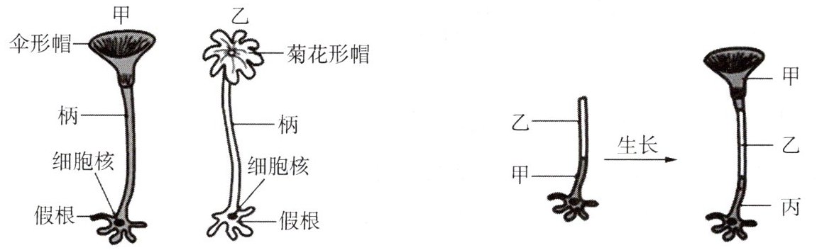 10. 伞藻是一类单细胞藻类,生活在热带和亚热带的海洋中。伞藻由单个细胞构成,一般长2~5cm,可分为帽、柄和假根三个部分,细胞核位于假根中。不同的伞藻有不同形状的帽,有的呈伞形(下图中的甲),有的呈菊花形(下图中的乙)。请据图分析并回答下列问题。
