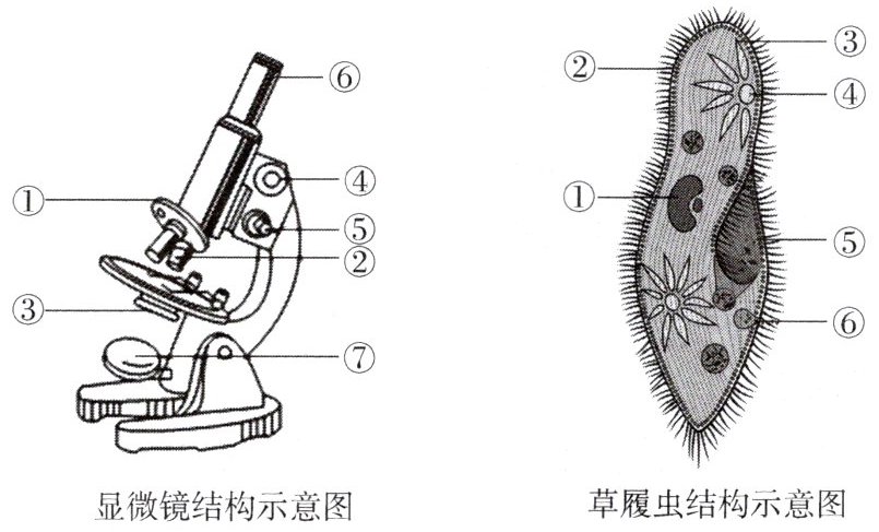 29. (14 分)显微镜是生物学研究中常用的观察仪器。下图为显微镜的结构以及用显微镜观察到的草履虫结构图,请据图回答下列问题。