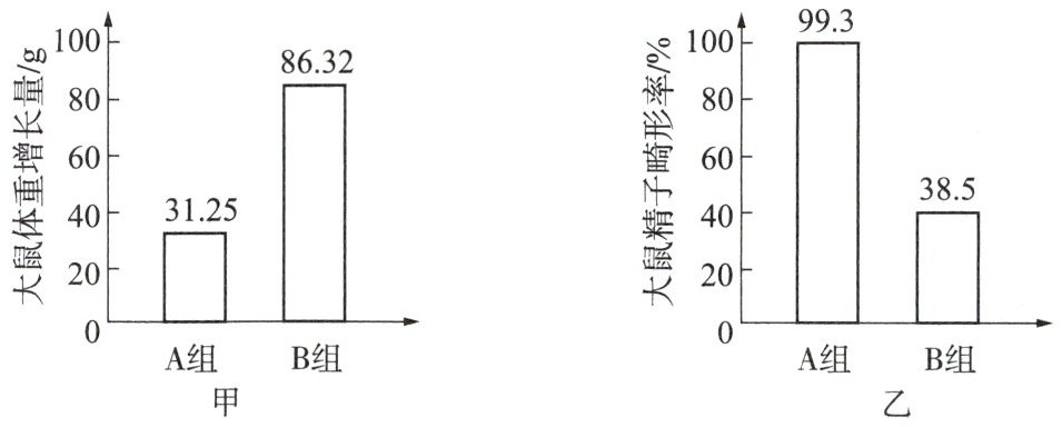 9. 为探究电脑辐射对身体健康的影响,某研究团队做了如下实验:将生长状况相同的健康成年雄性大鼠随机分成 A、B 两组,每组 10 只。将 A 组置于开机的电脑前,B 组置于相同的但未开机的电脑前,其他饲养条件都相同且适宜。两个月后获得实验数据如下页图甲、乙所示(精子是雄性鼠的生殖细胞)。下列分析正确的是(
