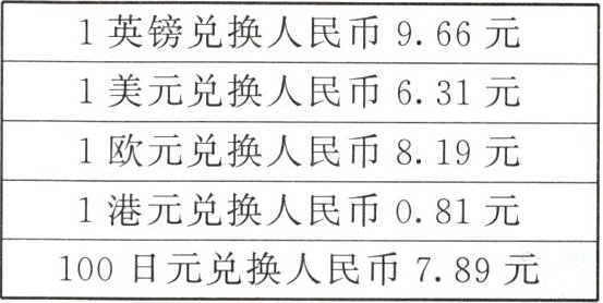 )欧元。(4)2000 元人民币分别能兑换多少英镑和日元?