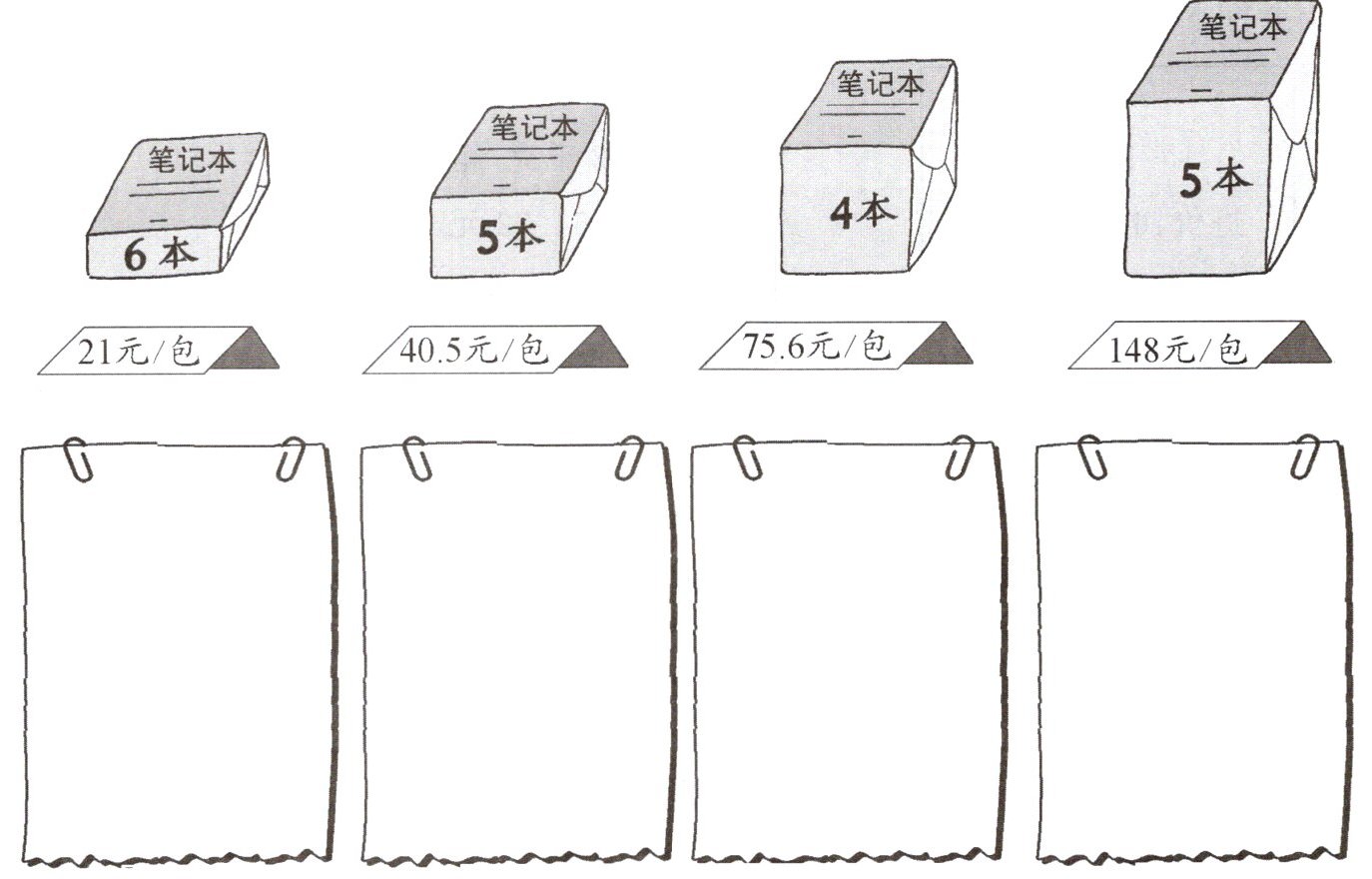 1. 各种包装的笔记本每本分别多少元?先估一估,再用竖式算一算,结合情境说一说竖式中每一步的意思。