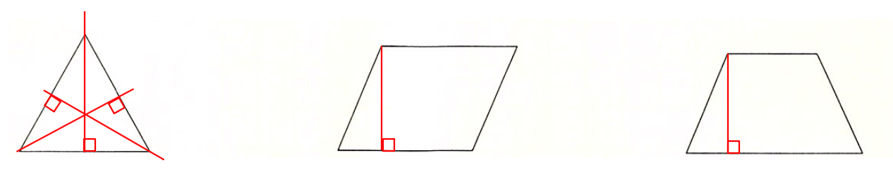 2. 想一想,下面各图形分别能画出几条高?画一画,填一填。