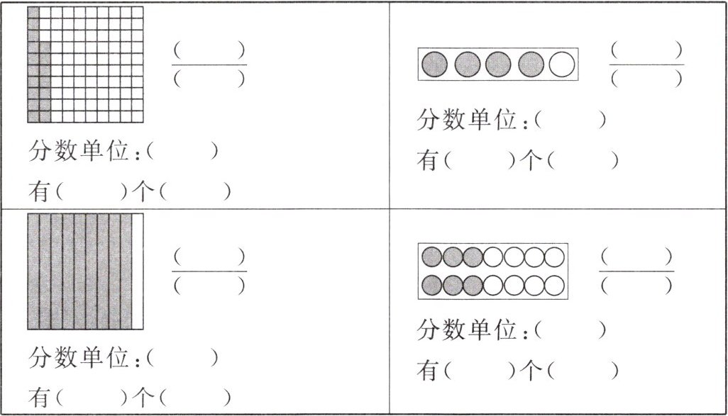 3. 先用分数表示下面各图中的涂色部分,再填一填。