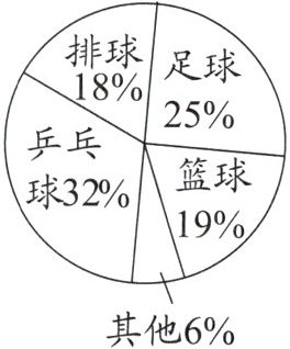 (1)百分比为喜欢各种球类活动的人数除以全班人数所得,18%+25%+32%+6%+19%=1(2)略
