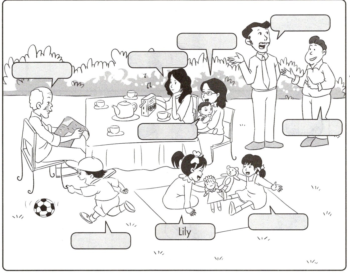 This is my family. Look, my grandfather is reading the newspaper. His name is Sam. A boy is playing football beside him. That is me. My name is Tony. My mother likes to listen to music. Her name is May. My aunt, Mary, is beside her. My father and my uncle are talking. My father is tall. His name is Mike. My uncle, Tim, is a very kind man. He is a little fat. My sister Lily and my cousin Ann are playing with toys. They are so happy. Where is Ann's little brother Bob? Can you find him?