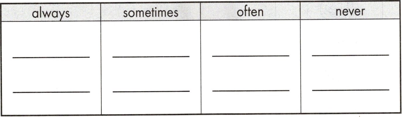 always: get up at half past five, make breakfast; sometimes: water the flowers, ride her bike; often: clean the room, walk to work; never: drive to school, late for work