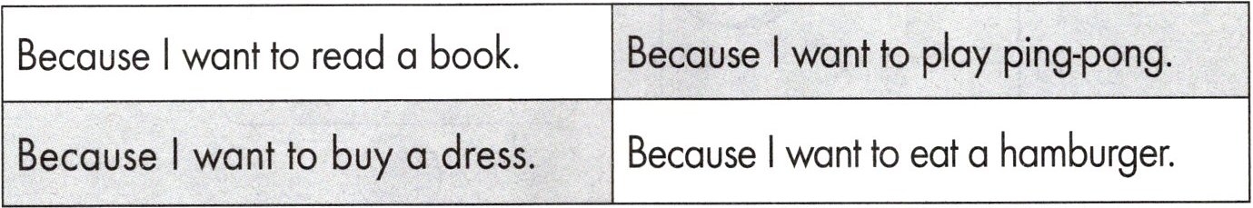 3. a. Because I want to play ping-pong. b. Because I want to eat a hamburger. c. Because I want to buy a dress. d. Because I want to read a book.