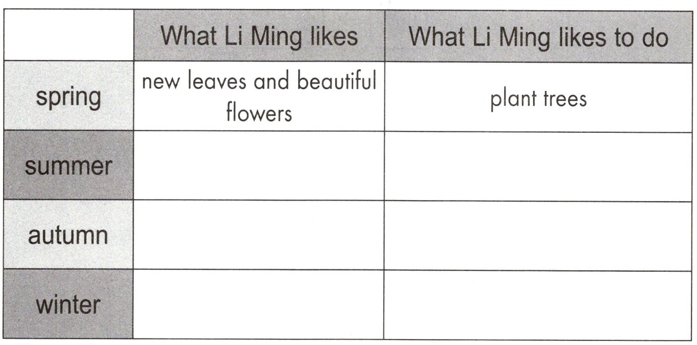 11. Read and write. 读一读,完成表格,并写出你最喜欢的季节。