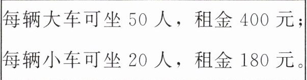 400÷50 = 8(元) 180÷20 = 9(元) 8 < 9 尽可能多租大车比较省钱。 220÷50 = 4(辆)……20(人) 400×4 + 180 = 1780(元) 答:租4辆大车,1辆小车最省钱,至少需要1780元。