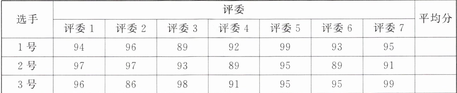(1)去掉一个最高分和一个最低分,计算出每名选手的平均分,把表格填写完整。