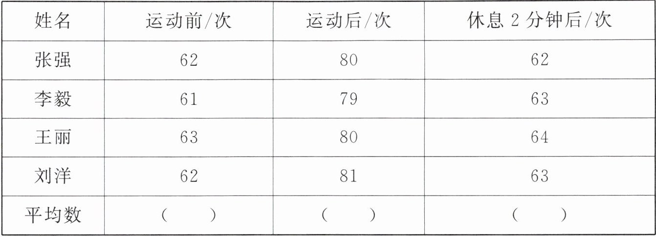 (1)算一算表格中“运动前”“运动后”“休息 2 分钟后”,4 位同学脉搏的平均数。