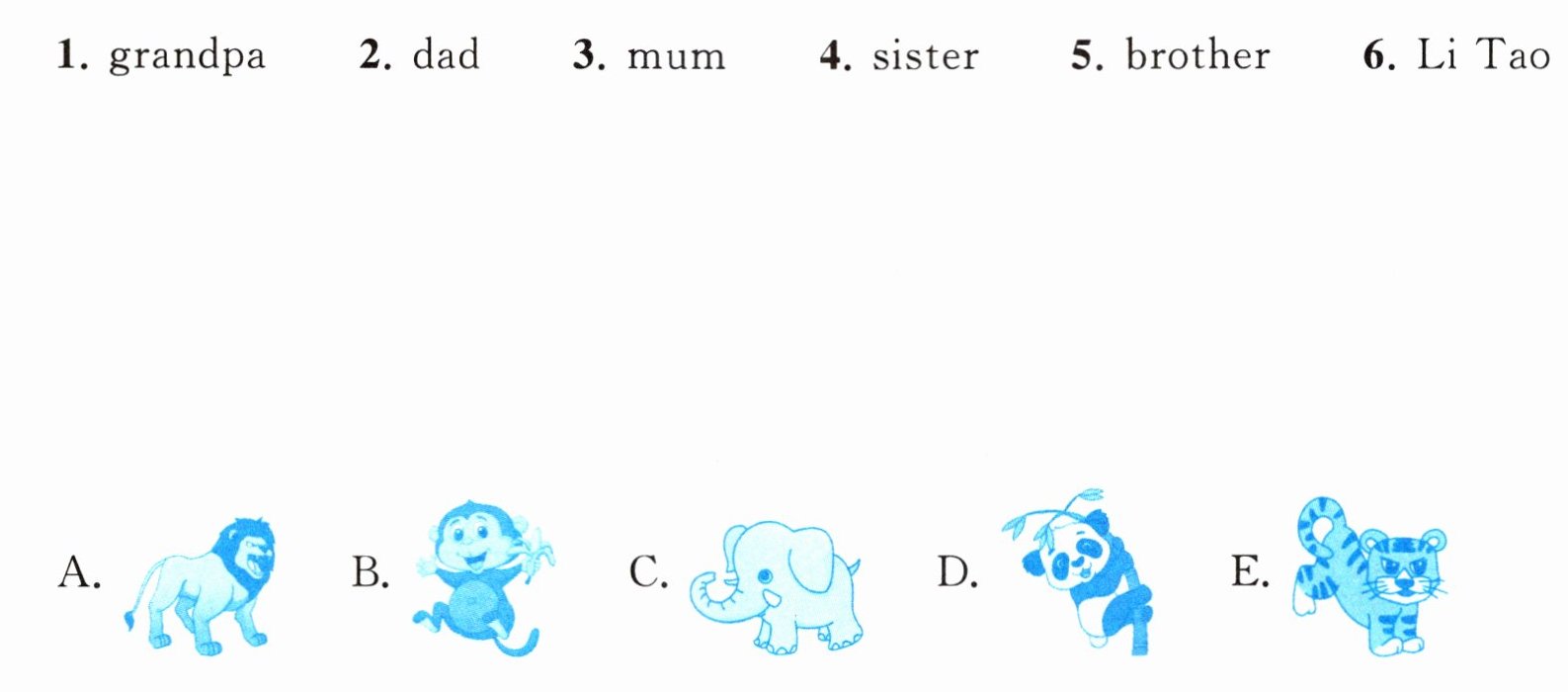 My name is Li Tao. I have a happy family. They are my grandfather, my father, my mother, my brother, my sister and me. We go to the zoo. My grandpa likes pandas. My father likes tigers. My mother likes lions. My brother likes monkeys. My sister likes elephants. I like elephants too.