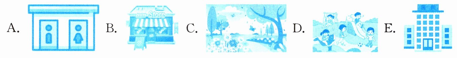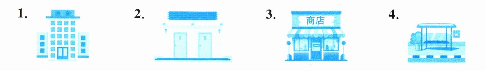 1. hospital 2. toilets 3. shop 4. bus stop