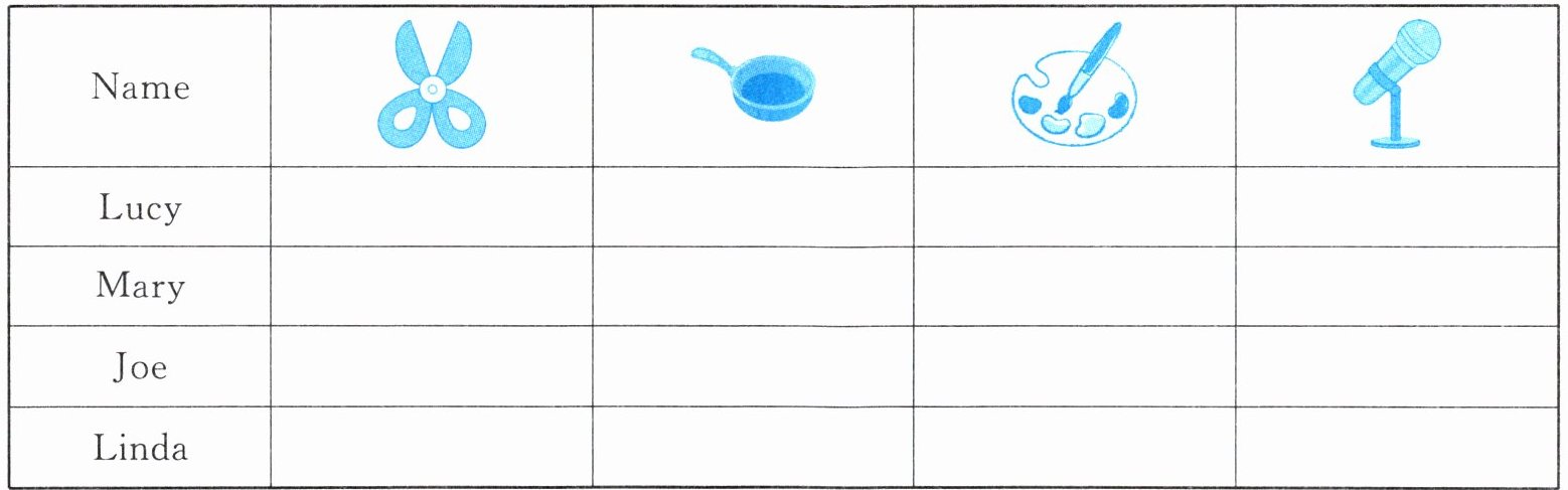 I have four friends. Lucy can sing English songs. Mary can draw pictures. Joe can do some chores. He can also make a gift. Linda can cook very well. We’ll have a party next Tuesday. What can you do for us?