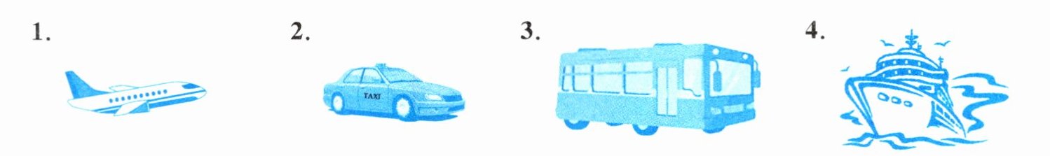 1. by plane 2. by taxi 3. by bus 4. by ship