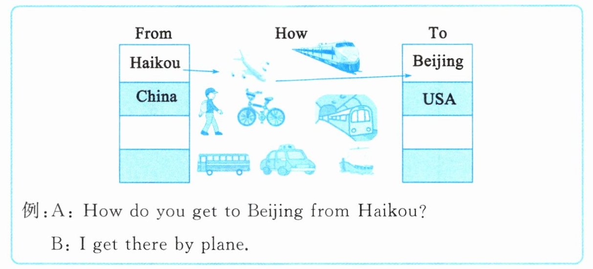 范例:A:How do you get to the USA from China? B: I get there by plane.