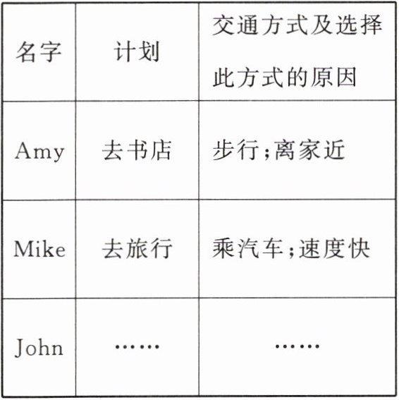 周末马上就要到了,同学们都有自己的旅行计划。根据下面的表格把大家的计划写出来吧!