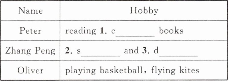 任务一:1. comic 2. singing 3. dancing 任务二:1. He likes playing basketball and flying kites. 2. I like playing the pipa and drawing pictures.(答案不唯一)