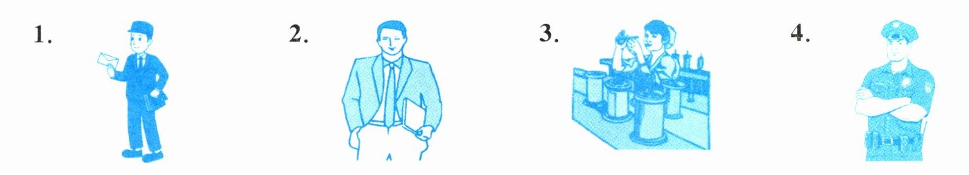 1. postman 2. businessman 3. worker 4. police officer