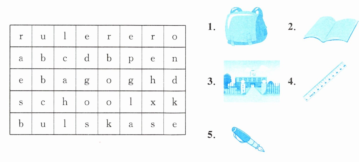 圈:1. bag 2. book 3. school 4. ruler 5. pen