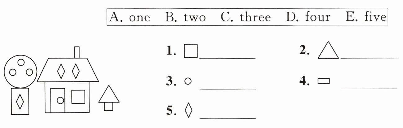 四、看图,数一数每种图形的个数,选择相应的选项写在横线上。