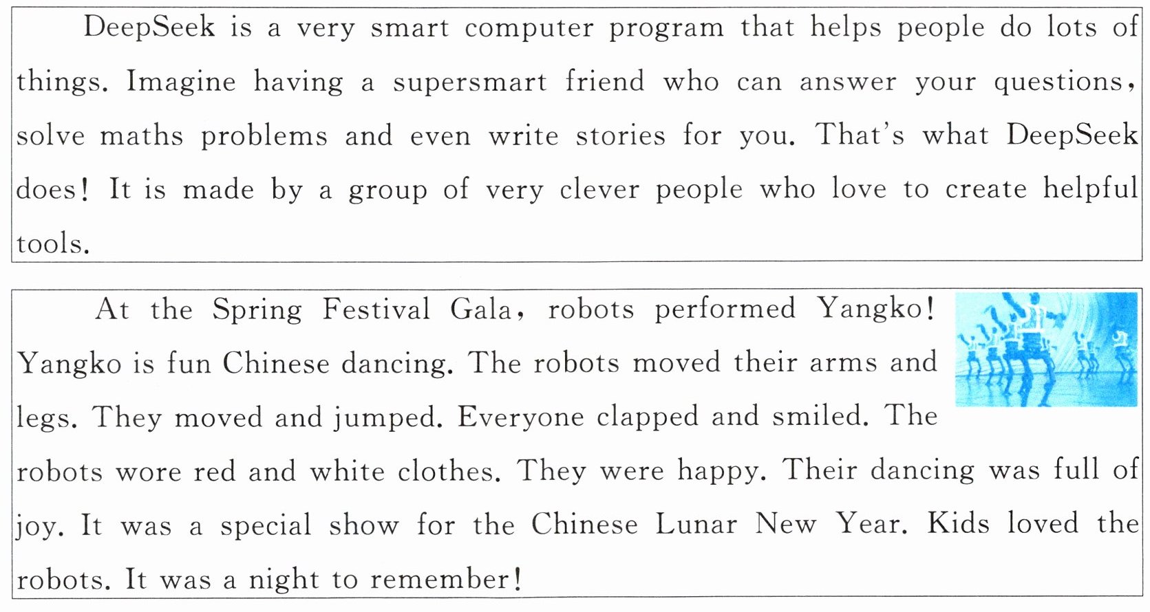 任务二:你了解 DeepSeek 吗?尝试向 DeepSeek 询问“Robots Perform Yangko”,看看它会给你怎样的解答。