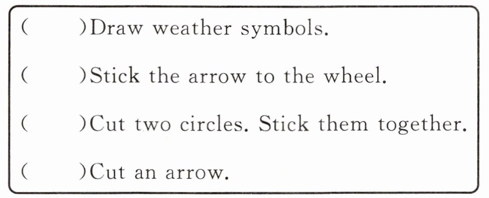 二、Dingding 想要让 Amy 教他制作一个天气轮盘。读对话,根据步骤将对话中的句子排序。