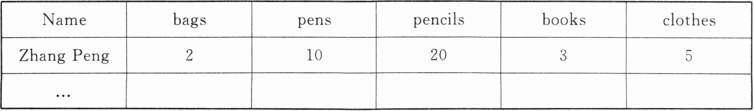 三、班级组织对山区孩子进行爱心捐赠,组长对捐赠物品进行登记,并用句型“What did you send? How many/much... did you send? I sent...”进行询问与回答,然后完成表格。