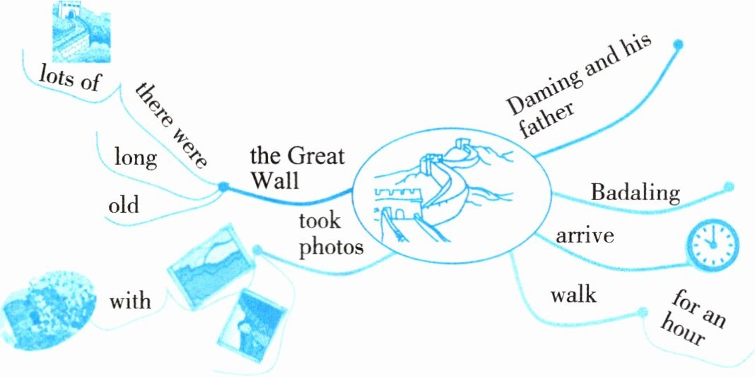 根据思维导图,可以说:"Daming and his father went to the Great Wall and took some photos. They arrived at Badaling and walked for an hour. The Great Wall is very old and very long. There were lots of people."