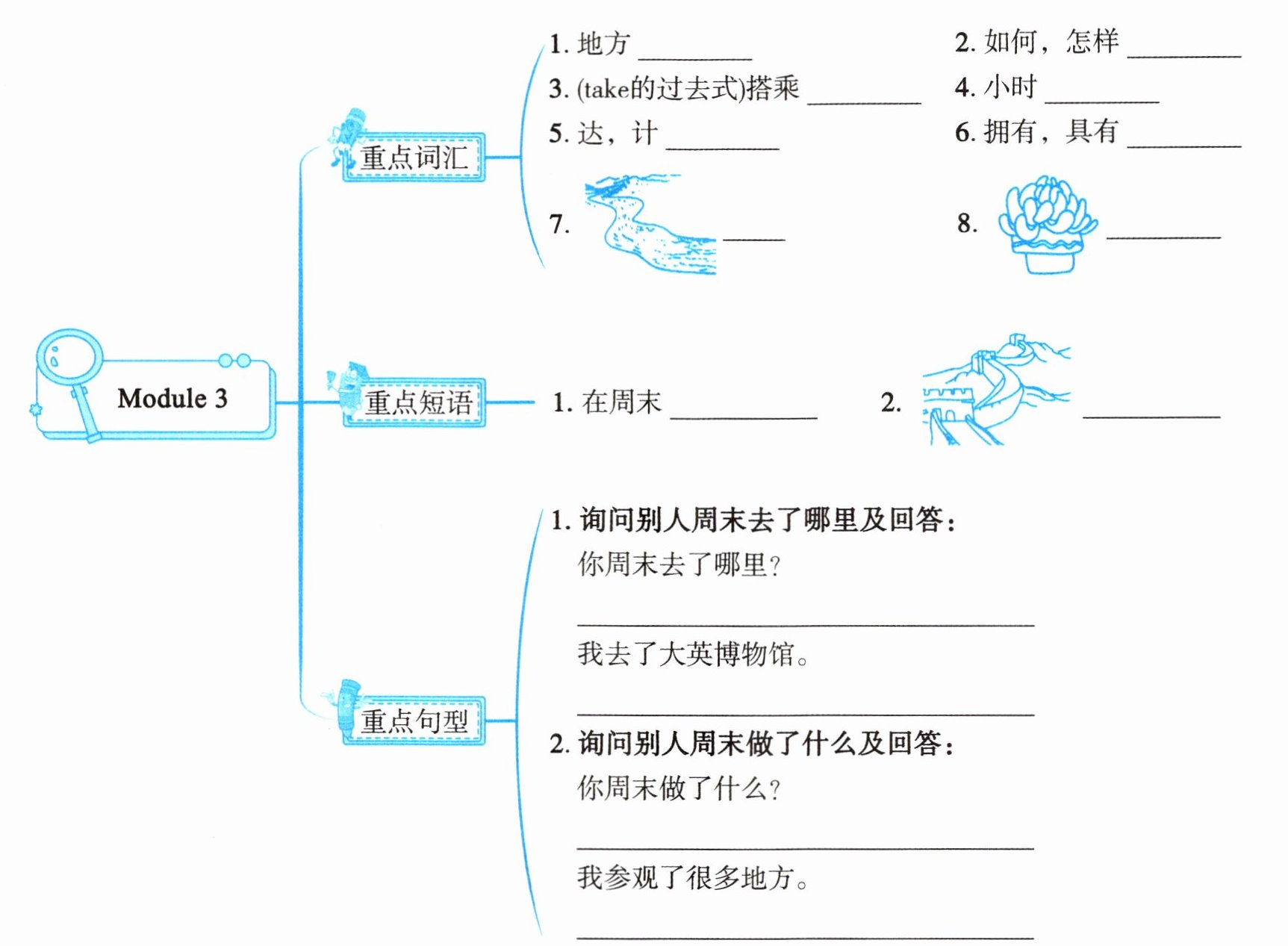 根据下面的思维导图,给自己的小伙伴说一说都做了什么事情。