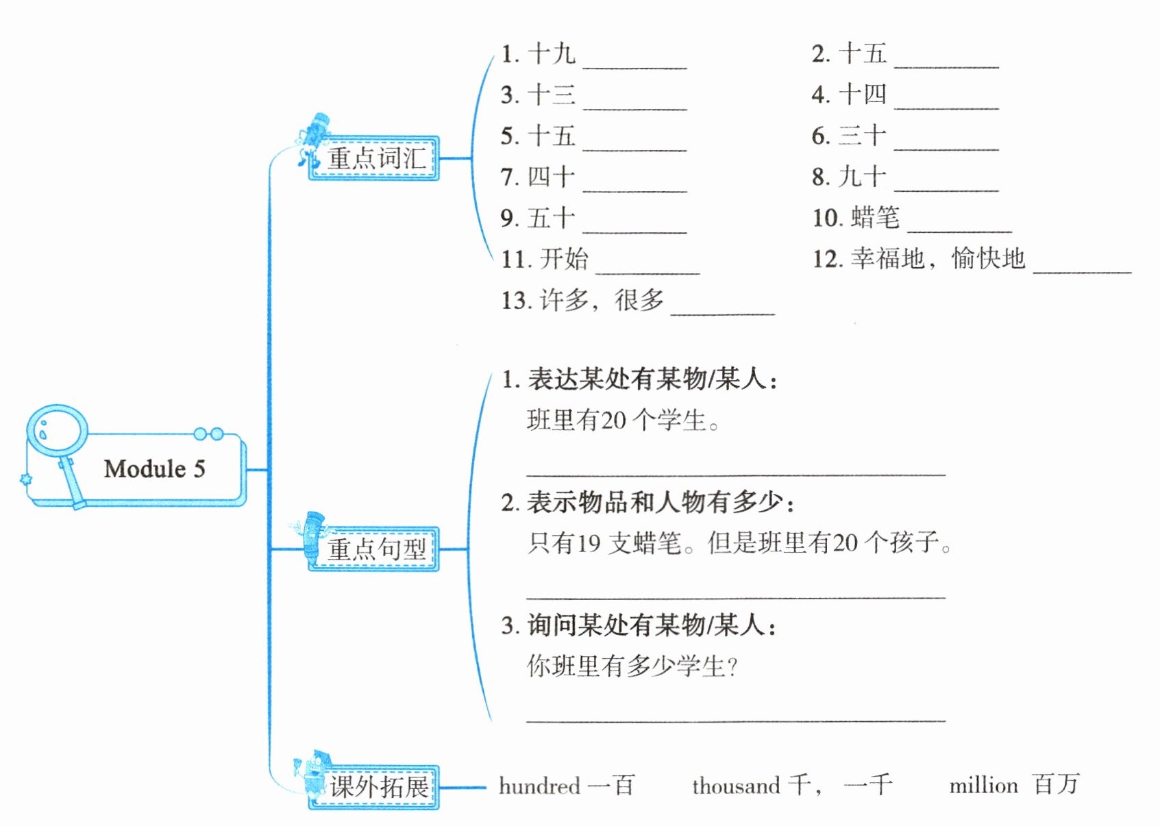 1. nineteen 2. fifteen 3. thirteen 4. fourteen 5. fifteen 6. thirty 7. forty 8. ninety 9. fifty 10. crayon 11. begin 12. happily 13. many 1. There are twenty pupils in the class. 2. There are only nineteen crayons. But there are twenty children in the class. 3. How many pupils are there in your class?