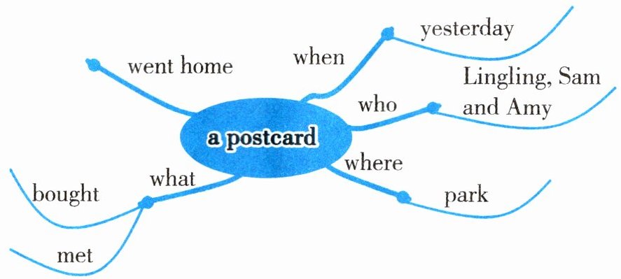 Yesterday, Lingling, Sam and Amy met in the park. They bought a postcard. Then they went home. (画图提示:画三个孩子在公园相遇,一起买明信片,之后回家的场景)