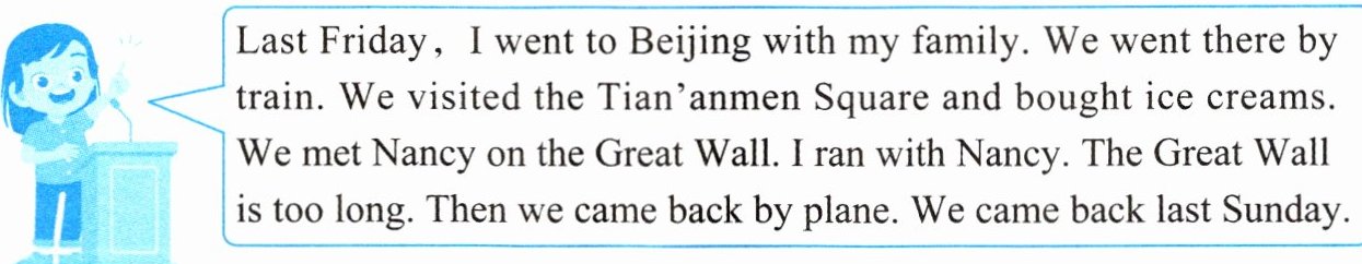 Last Friday, I went to Beijing with my family. We went there by train. We visited the Tian'anmen Square and bought ice creams. We met Nancy on the Great Wall. I ran with Nancy. The Great Wall is too long. Then we came back by plane. We came back last Sunday.
