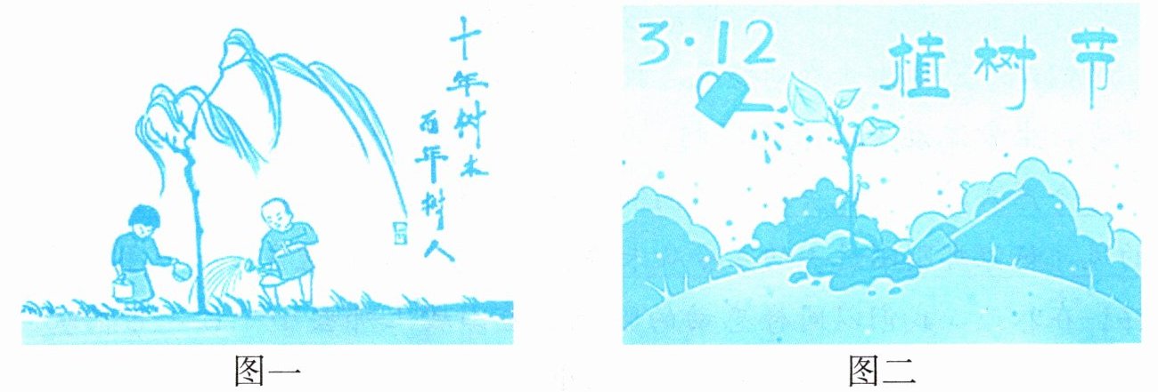 6.(1)示例:图二合适。图二画而主体部分是一棵树,还有一把壶在浇水,喻指给绿色以滋润,“植树节”三个大字也很醒目,突出植树节的主题;而图一画面中虽然是两个人在给树浇水,文字部分的“十年树木 百年树人”却更彰显“育人”的重要意义。