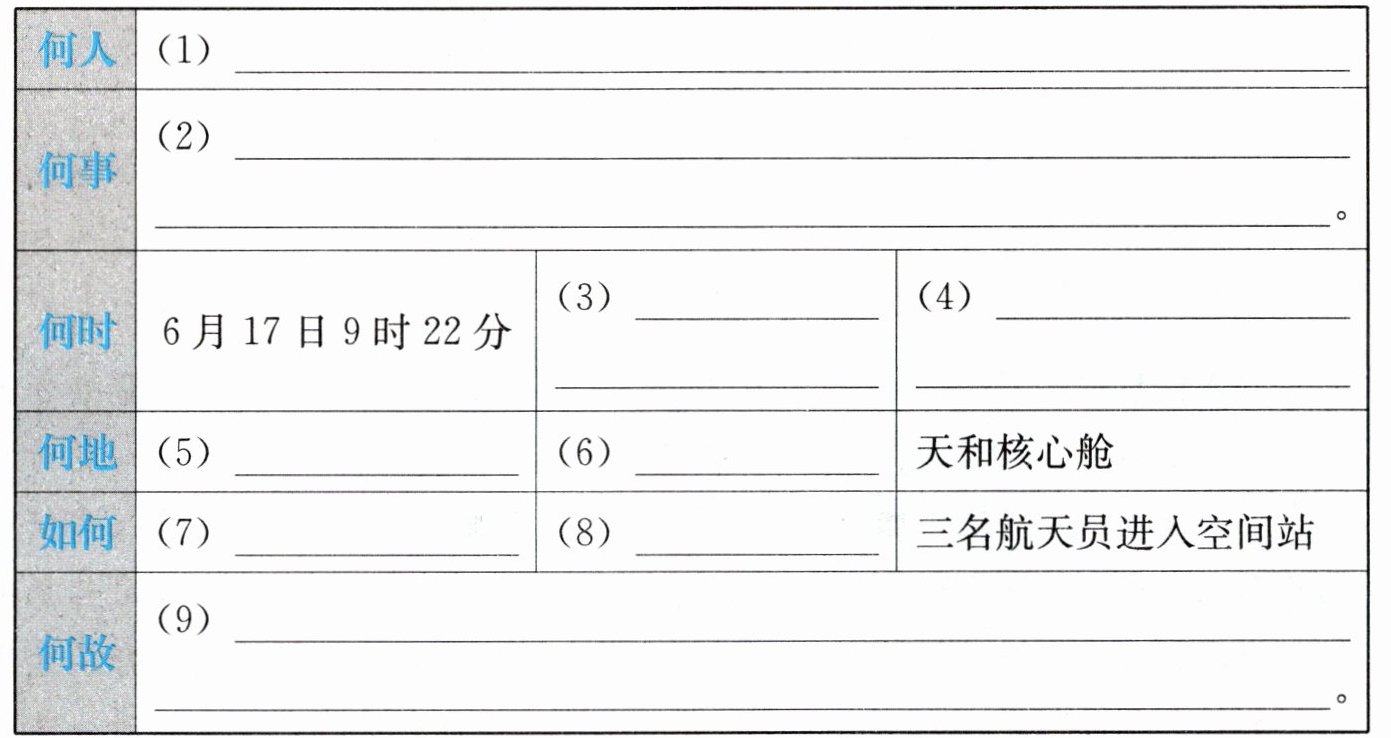 3. (1)航天员聂海胜、刘伯明、汤洪波 (2)神舟十二号载人飞船在酒泉卫星发射中心发射升空,准确进入预定轨道,顺利将三名航天员送上太空 (3)6月17日15时54分 (4)6月17日18时48分 (5)酒泉卫星发射中心 (6)天和核心舱前向端口 (7)发射升空 (8)神舟十二号载人飞船成功对接 (9)完成为期三个月的在轨驻留,开展机械臂操作、出舱活动等工作,验证航天员长期在轨驻留、再生生保等一系列关键技术