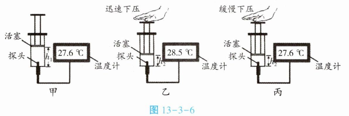 小明在第二次实验中缓慢下压活塞(在这个过程中,筒内分子数目不变),针筒末状态及温度计示数如图 13-3-6 丙所示,则从甲到丙的过程中: