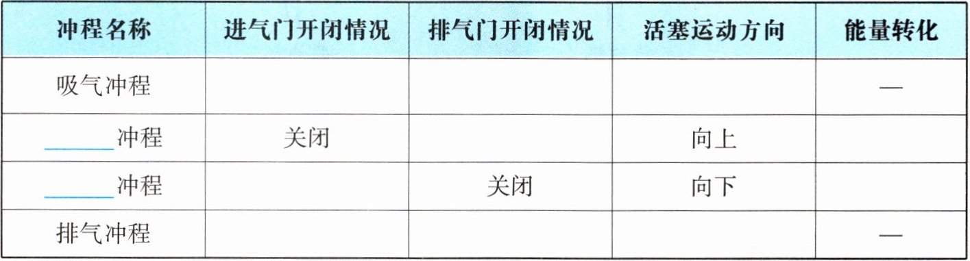 1. 气缸内气体的内能转化为活塞的机械能。 压缩气缸内的气体。 2. 活塞向上运动,活塞的机械能转化为气缸内气体的内能。 不能。3. 活塞向上运动,将废气从排气门推出气缸。 4. 活塞向下运动。 5. 吸气冲程、压缩冲程、做功冲程、排气冲程