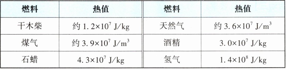 |干木柴|约 $1.2×10^{7}J/kg$|天然气|约 $3.6×10^{7}J/m^{3}$|