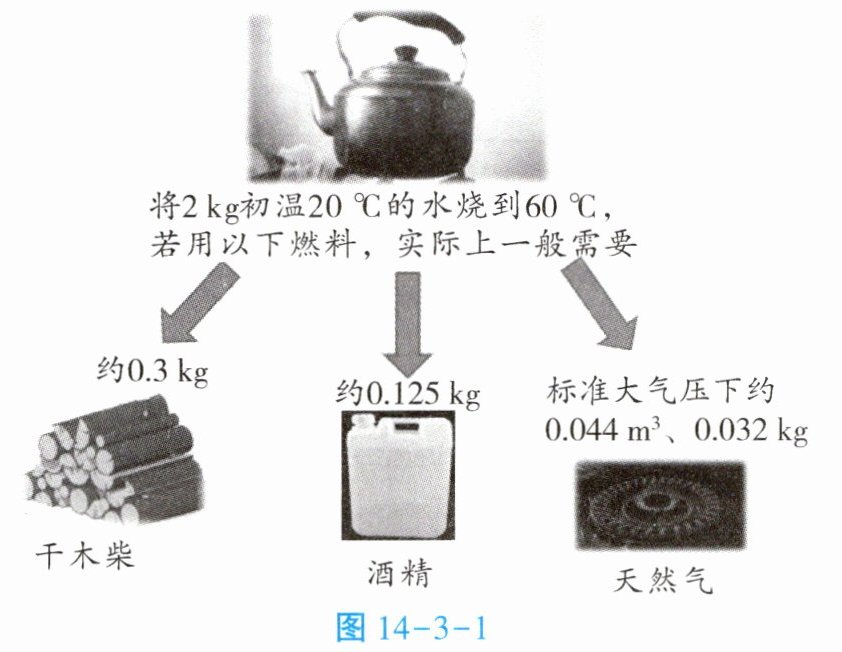 【活动一】在生活中,我们常通过燃烧燃料来获得能量。如图 14-3-1,我们可以通过燃烧不同燃料(干木柴、酒精、天然气)将同一锅水烧到 $60^{\circ}C$,但在水吸收相同热量的情况下,不同燃料消耗的质量不同,则燃烧相同质量的不同燃料,燃料释放的热量