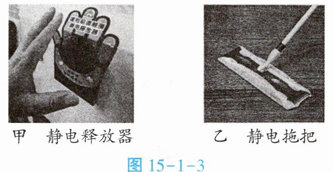 后聚集了大量的电荷,电荷间发生剧烈的作用而引起的。这是一种静电现象。生活中遇到易燃、易爆物品时,要注意防止静电的产生,如图 15-1-3 甲所示。2. 有时我们也需要利用静电。例如,静电拖把就利用