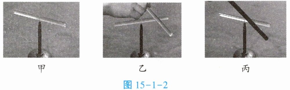 如图 15-1-2 甲所示,将一根用丝绸摩擦过的玻璃棒放在支架上,玻璃棒在水平面内能够自由转动。