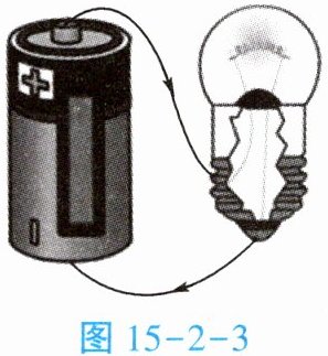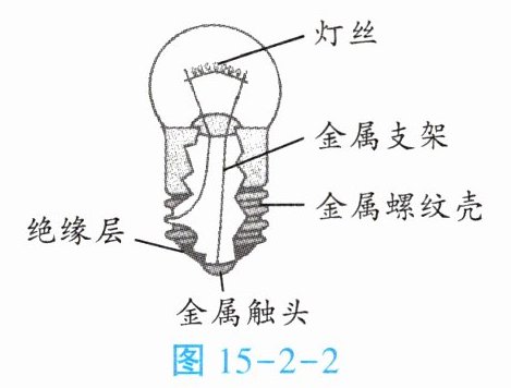 1. 演示实验:小灯泡的结构如图 15 - 2 - 2 所示,用一节干电池、两根导线将一个小灯泡点亮,如图 15 - 2 - 3。