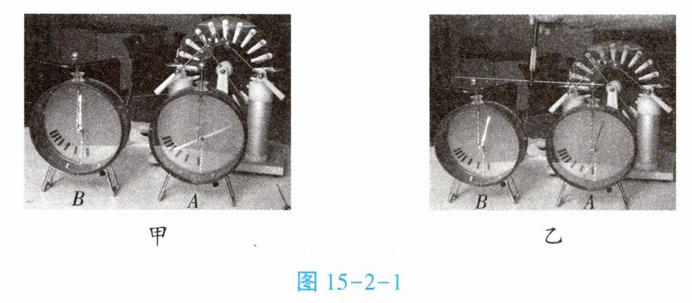 取两个相同的验电器 $ A $ 和 $ B $,用起电机使 $ A $ 带电,$ B $ 不带电,如图 15 - 2 - 1 甲所示。