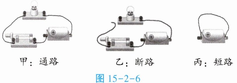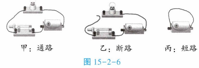1. 演示实验:如图 15 - 2 - 6 所示的几个电路分别为通路、断路和短路。请你观察各电路有什么现象发生。