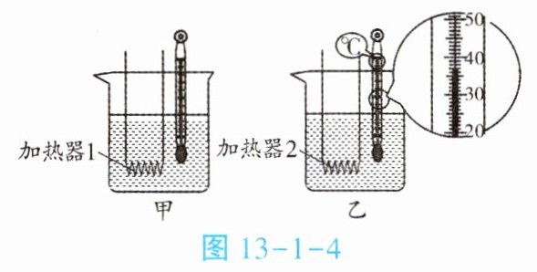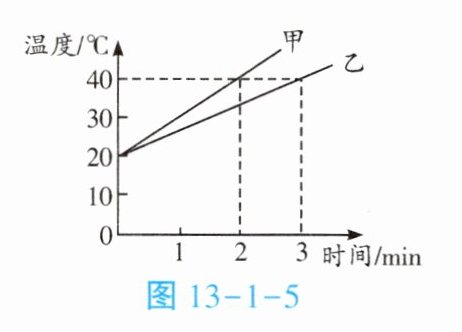1. 如图13-1-4所示,规格相同的容器内装有相同质量的纯净水。用不同加热器加热,忽略散热,得到图13-1-5所示的水温与加热时间的关系图线,则(
