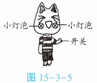 1. 一只玩具猫外形如图 15-3-5 所示,猫体内有电池,猫手相当于开关,向下压猫手,猫脸上的两个小灯泡会一起发光。把你猜想的猫体内的电路图画在下面的虚线框内。